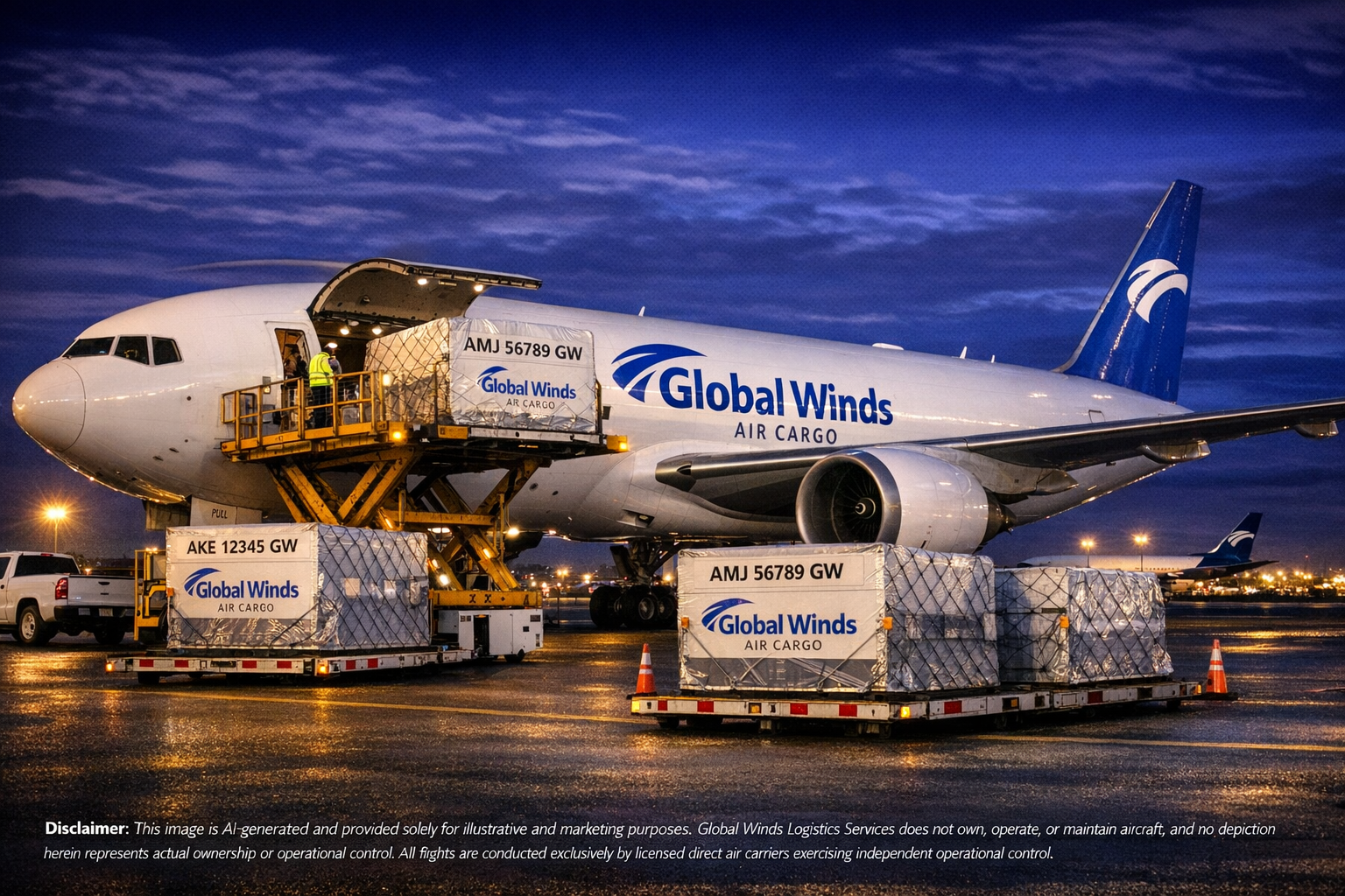 Legally Protective AI‑Image Disclaimer These images of Global Winds are/is AI‑generated and provided solely for illustrative and marketing purposes. Global Winds Logistics Services does not own, operate, or maintain aircraft. All air transportation services are performed exclusively by duly licensed direct air carriers exercising independent operational control.
